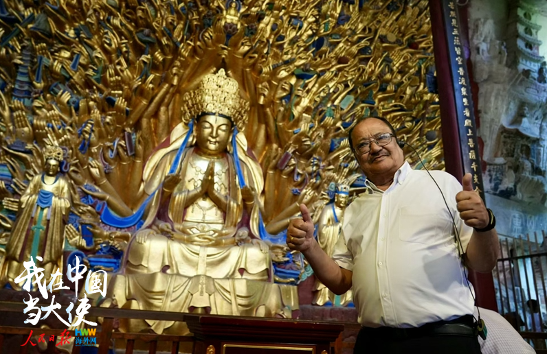 5月19日,尼泊尔驻华大使比什努·施雷斯塔在大足石刻宝顶山景区留影。(海外网 谢明 摄)