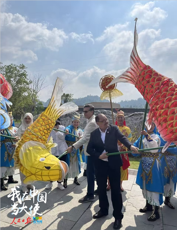 5月19日,参加“机遇中国·品牌重庆”驻华使节重庆行活动的驻华使节在大足体验鲤鱼灯舞。(海外网 谢明 摄)