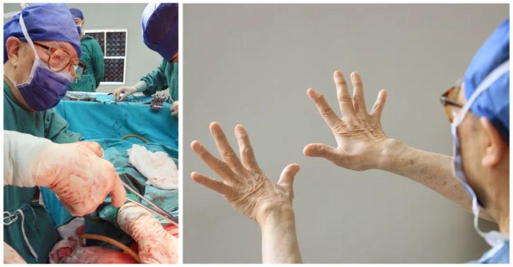 左图:吴孟超在为病人进行手术;右图:吴孟超展示他常年握止血钳的双手(拼版照片)。新华社记者 王建民 摄