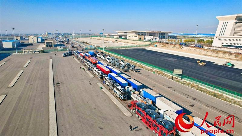 霍尔果斯公路口岸,等待通关的汽车。人民网 李欣洋摄