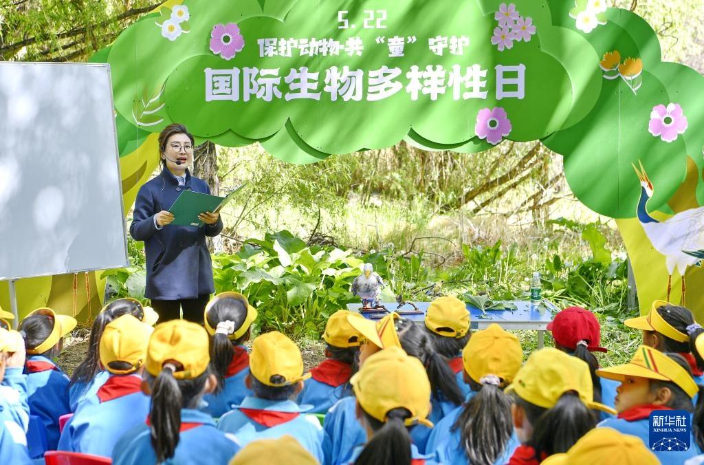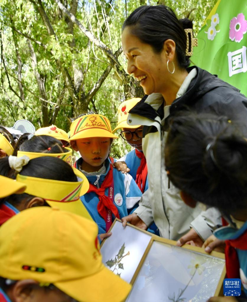 5月22日,西藏大学生态环境学院副教授索南措向小学生普及植物多样性知识。新华社记者 张汝锋 摄