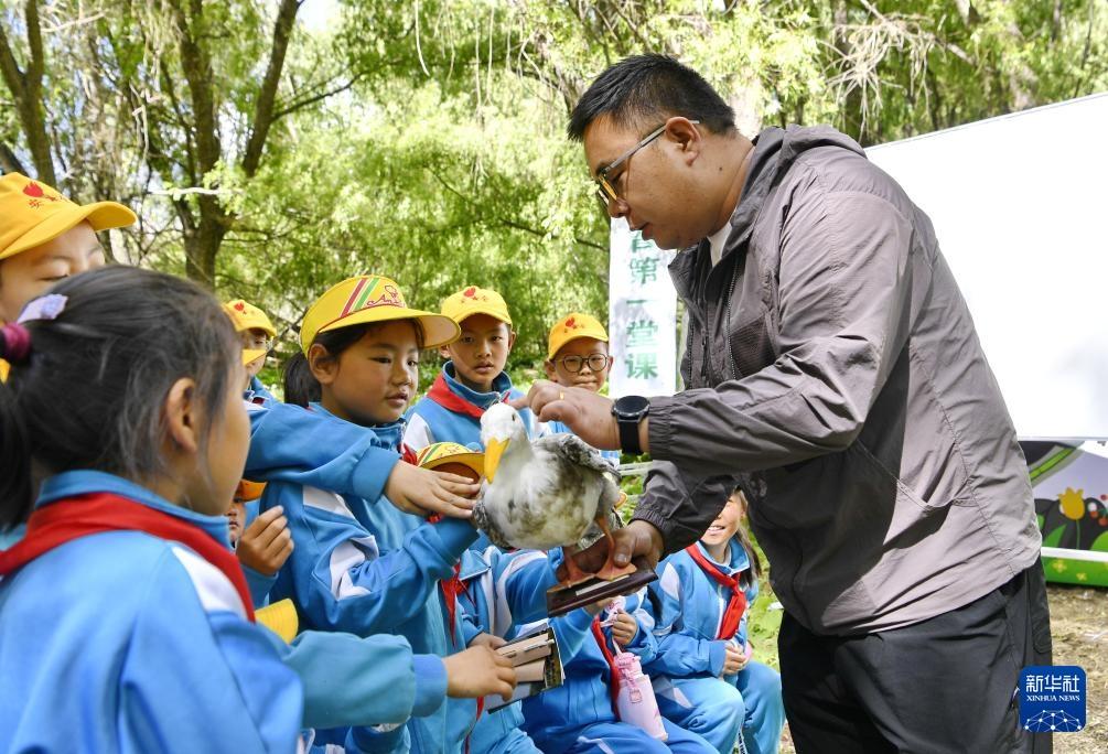5月22日,拉鲁湿地国家级自然保护区管理局局长拉姆次仁在活动中邀请小学生做“小小宣讲员”和“拉鲁湿地小卫士”。新华社记者 张汝锋 摄