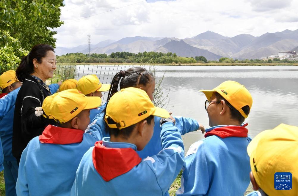 5月22日,拉鲁小学师生一起观赏拉鲁湿地美景。新华社记者 张汝锋 摄