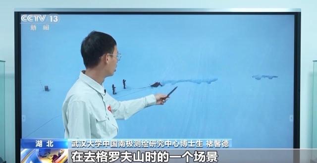 武汉大学中国南极测绘研究中心博士生 褚馨德:这是我们当时在去格罗夫山时的一个场景。有些冰裂隙的区域,它其实是被积雪覆盖的,就是人的肉眼是无法看到的,那么这个时候,人员在冰裂隙附近作业的话会比较危险。