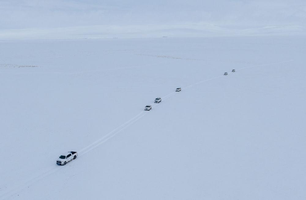 野生动物专业管护队员的车队在大雪中巡护(无人机照片,5月8日摄)。新华社记者 丁增尼达 摄