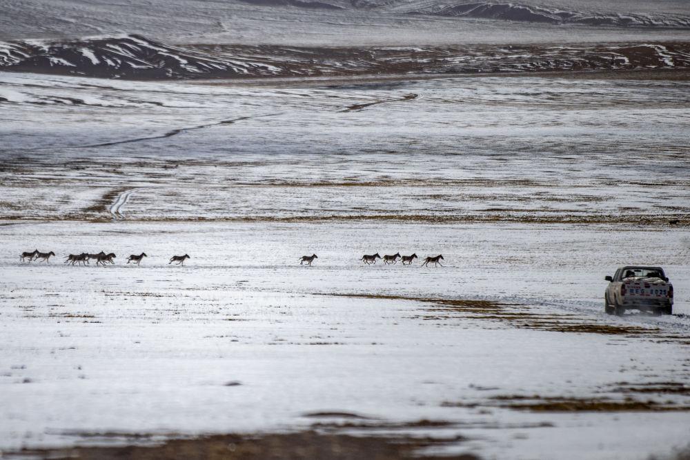 成群的藏野驴从野生动物专业管护队员们的车前跑过(5月9日摄)。新华社记者 姜帆 摄