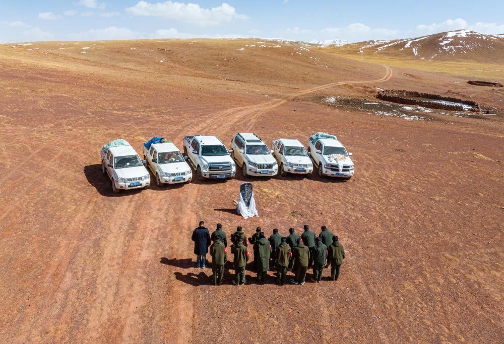野生动物专业管护队员在罗布玉杰烈士纪念碑前默哀致敬(无人机照片,5月10日摄)。新华社记者 姜帆 摄