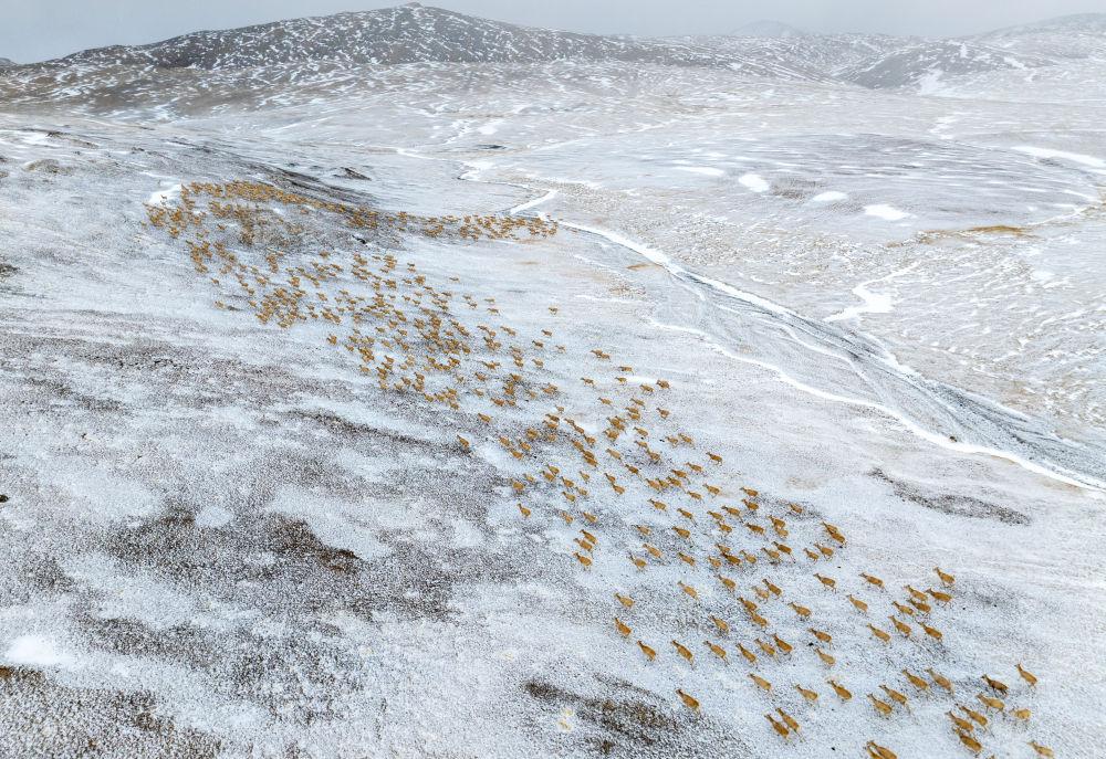 大群藏羚羊正在向产羔地迁徙(无人机照片,5月10日摄)。新华社记者 姜帆 摄