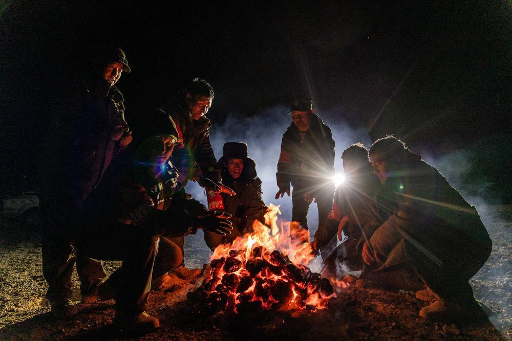 野生动物专业管护队员在宿营地的寒夜里烤火,燃料是野牦牛的粪便(5月10日摄)。新华社记者 丁增尼达 摄