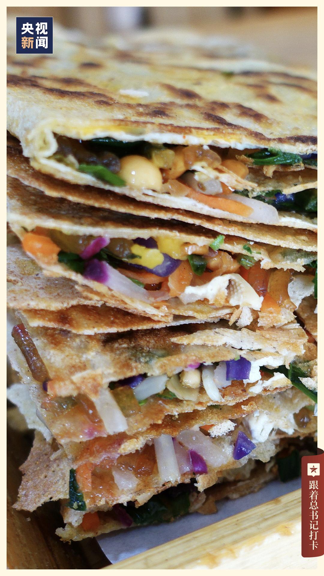 菜煎饼:一张大煎饼上铺满颜色各异的蔬菜,豆芽、胡萝卜、甘蓝、包菜等,营养丰富的蔬菜+杂粮煎饼,妥妥的健康餐。