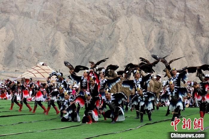 近日,2024年新疆阿合奇县猎鹰文化旅游季拉开帷幕,活动现场猎鹰手与舞蹈演员共同演绎猎鹰舞。陶拴科 摄