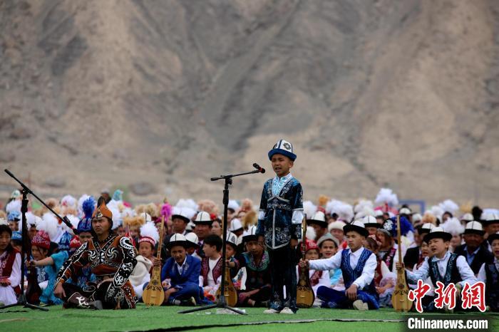 近日,2024年新疆阿合奇县猎鹰文化旅游季拉开帷幕,现场小玛纳斯奇传承人为观众说唱《玛纳斯》。陶拴科 摄