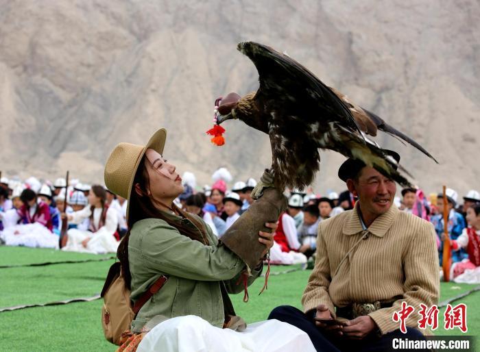 近日,2024年新疆阿合奇县猎鹰文化旅游季拉开帷幕,游客现场与猎鹰互动。陶拴科 摄