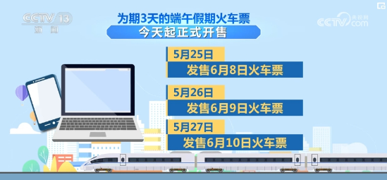 为期3天的端午假期火车票5月25日起正式开售。其中,5月25日发售6月8日火车票、5月26日发售6月9日火车票、5月27日发售6月10日火车票。