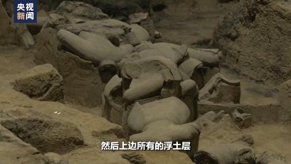 秦始皇帝陵博物院文物保护修复专家 兰德省:因为经过了大火焚烧,经过大水的漫灌,然后上边所有的浮土层,压塌了以后,底下各个陶俑都是已经倒塌了。有的胳膊在这,有的腿在那边。我们就根据这个方位和破洞,来看一看这一件陶俑它的残破程度,以及它残破的倒向。所有的残片它有个相互的互配性,就是两两相配。那么一般甲钉甲片,都是在胸前或者胸后,凹凸不平的这一面和凹进去这一面,我们一看就能分辨到它这个甲有的在前和在后。残破的俑头看得比较清楚,你看这件我一拿上来,应该知道这是哪个部位。