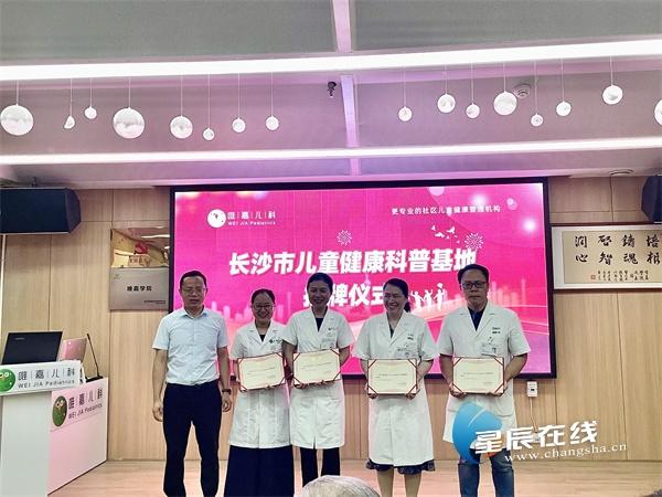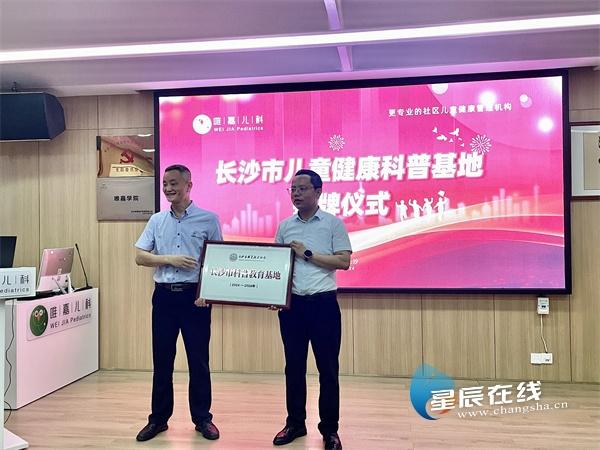 星辰在线5月24日讯 孩子身高的最佳干预期是什么时候?孩子胖是养的好吗?儿童性早熟有哪些表现?……5月24日,长沙市儿童健康科普基地揭牌仪式在唯嘉儿科举行,长沙市科协党组成员、副主席贺宽和长沙市儿童健康科普馆名誉馆长、著闻医生集团理事长、国之名医易著文共同为基地揭牌。