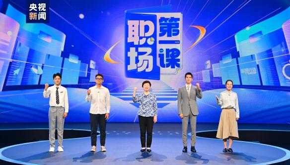 △《职场第一课》节目演讲嘉宾中国工程院院士、北京航空航天大学教授苏东林,青年演员于适,“中国青年五四奖章”获得者、鞍钢集团钢铁研究院焊接与腐蚀研究所副所长胡奉雅,浙江建设技师学院建筑艺术系教师、世界技能大赛抹灰与隔墙系统项目冠军马宏达与应届毕业生代表现场互动