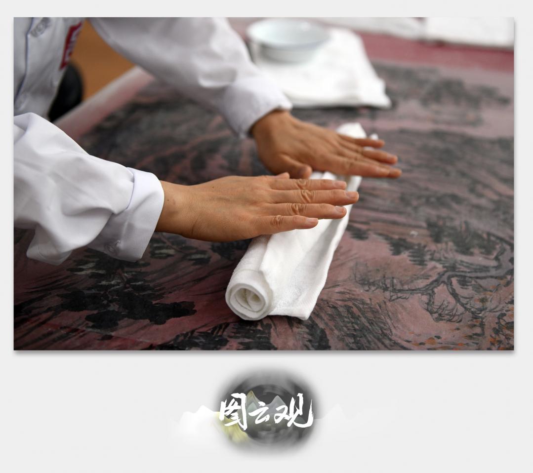 古书画修复最核心的步骤是:洗、揭、补、全等,每一步都需要极大的耐心与精准的手艺。洗画芯,就是要将旧画洗净,清洗过后用毛巾挤吸出脏水,需要非常小心,不伤及命纸及画芯。