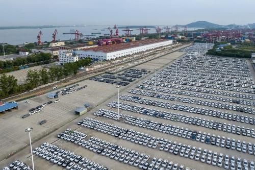 5月26日,在安徽芜湖港朱家桥港区国际集装箱码头,整齐排列的汽车等待出口(无人机照片)。 新华社发(肖本祥 摄)