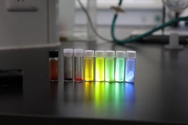 玻璃小瓶中的AIE材料粉末通过紫光灯的直射下发出强烈的荧光。(王茜/摄)