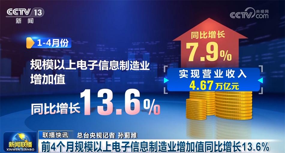 工业和信息化部数据显示,1—4月份,我国电子信息制造业生产稳步增长,行业整体增势明显。规模以上电子信息制造业增加值同比增长13.6%,实现营业收入4.67万亿元,同比增长7.9%。
