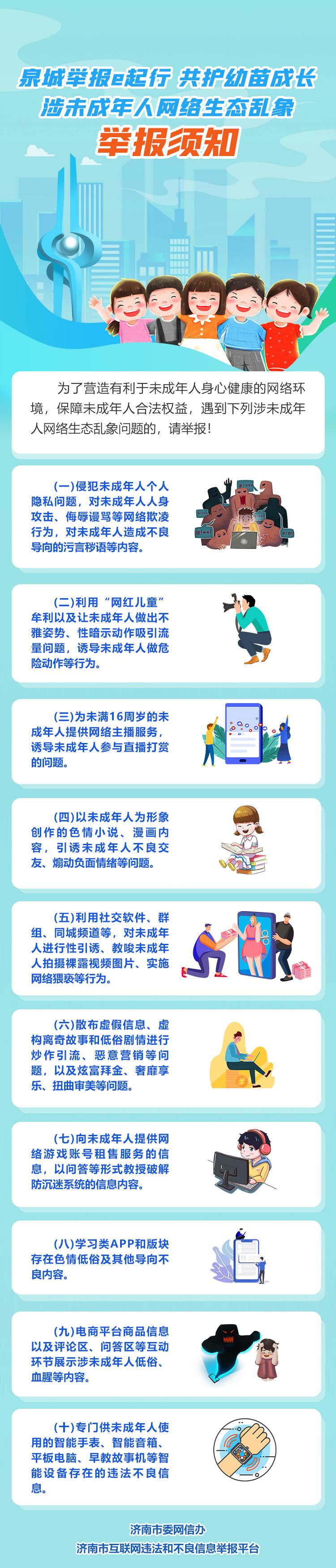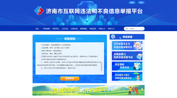 为贯彻落实全国网络举报工作会议暨一体化机制建设推进会精神,以及山东省委网信办关于网络举报工作部署要求,在“六一”儿童节即将到来之际,济南市委网信办携手济南市教育局、济南市文明办,共同推出“泉城举报e起行 共护幼苗成长”涉未成年人网上有害信息举报专区,持续护航未成年人健康成长,共筑清朗网络空间。