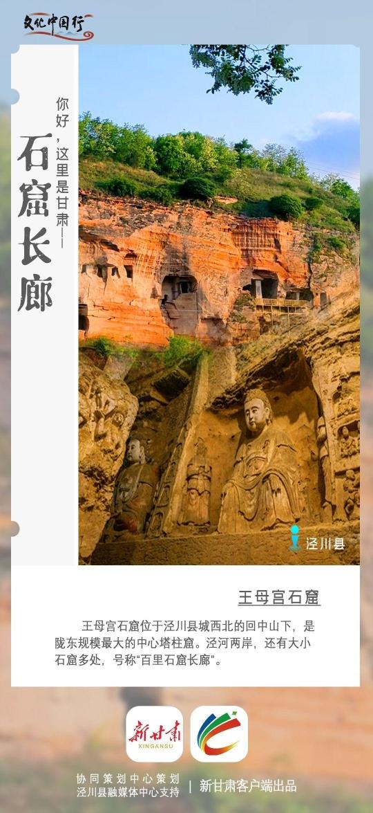 王母宫石窟位于泾川县城西北的回中山下,是陇东少见的规模最大的中心塔柱窟。泾川县境的泾河两岸,还有大大小小的石窟多处,号称“百里石窟长廊”,其中的罗汉洞、丈八寺等还有不少遗存。2006年,王母宫石窟被公布为全国重点文物保护单位。