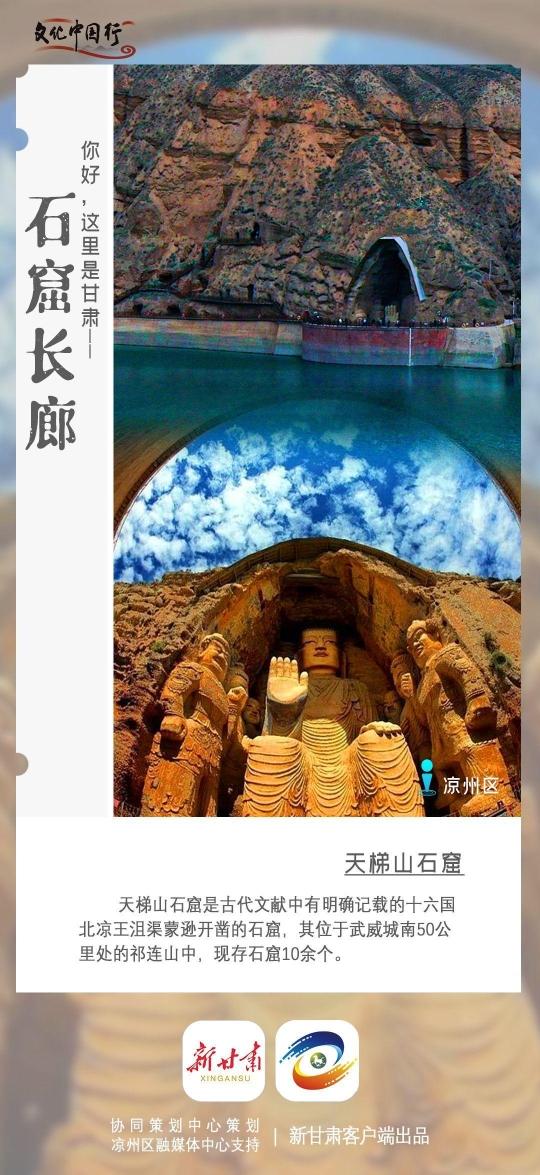 天梯神韵 光耀华夏——走近“石窟鼻祖”天梯山石窟。天梯山石窟是古代文献中有明确记载的十六国北凉王沮渠蒙逊开凿的石窟,其位于武威城南50公里处的祁连山中,现存石窟10余个,大部分窟龛中的造像、壁画因1958年修水库搬迁(现多数在武威市博物馆、甘肃省博物馆展出),现保存完好的只有大佛窟。