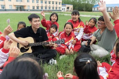 2023年5月29日,在安达市任民镇中心小学校园的草坪上,音乐老师李平(左一)和张雨与音乐班的孩子一起练习合唱。