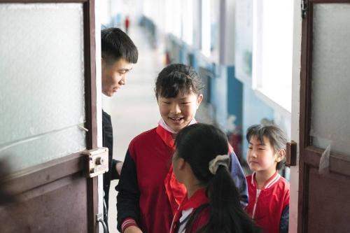 5月29日,在安达市中本镇中心小学,李平(左二)、张雨(左一)和“村里的孩儿”音乐班的新成员一起唱歌、交流。