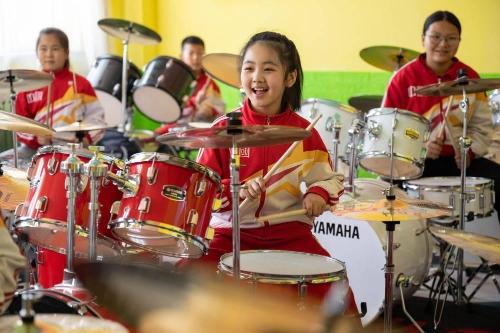 5月29日,在安达市任民镇中心小学,“村里的孩儿”音乐班成员于佳彤(右二)在鼓教室中练习打架子鼓。