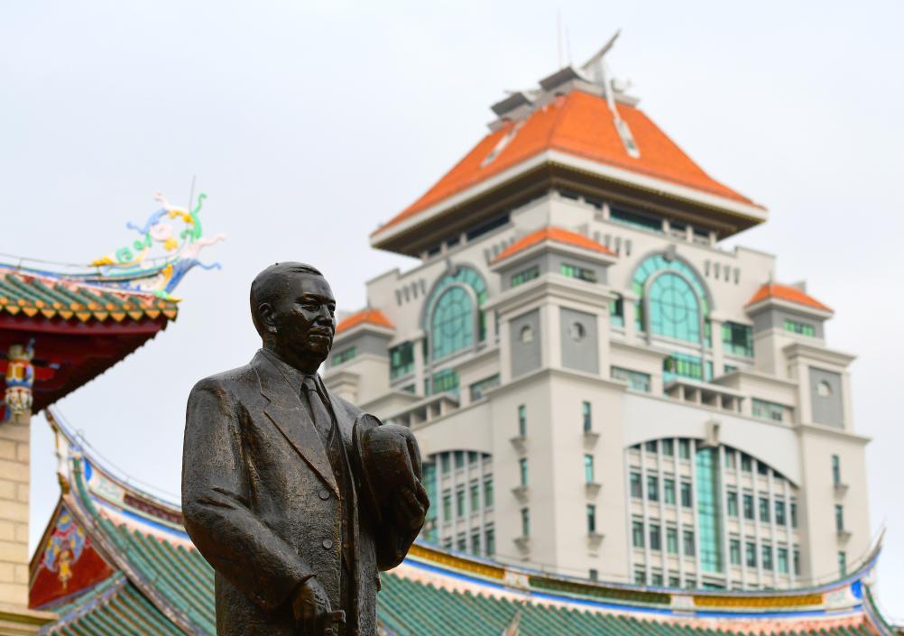碧空悠悠,湖水如镜。西洋风格搭配闽南传统燕尾脊屋顶的建筑坐落于葱翠之中,陈嘉庚雕塑在晨光中投下长长的影子,学生们迈着轻快的步伐赶往教室。厦门大学马来西亚分校(简称“厦大马校”)的清晨充满生机。