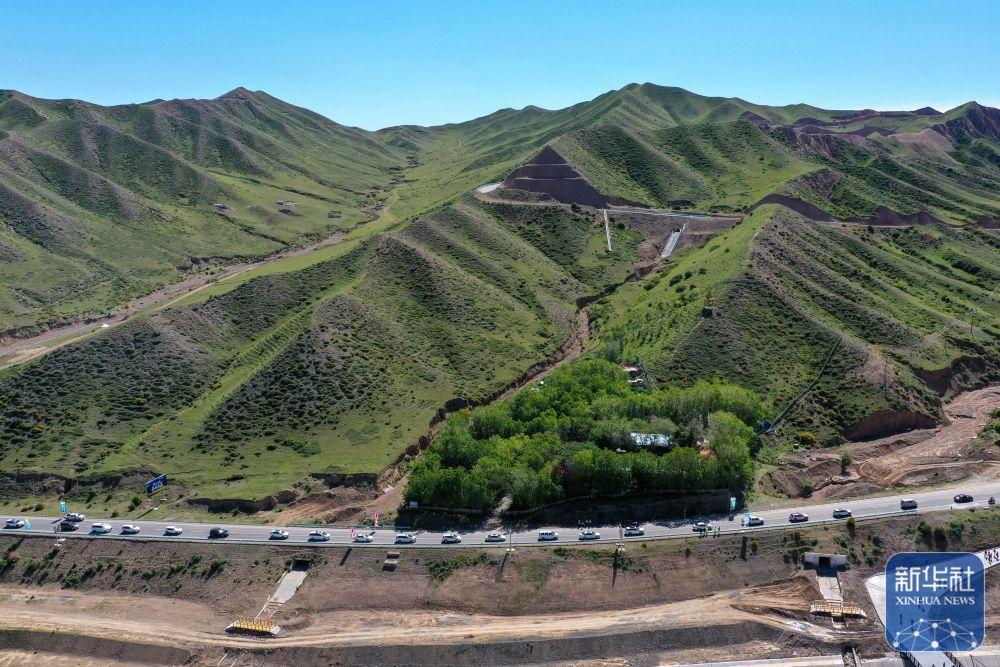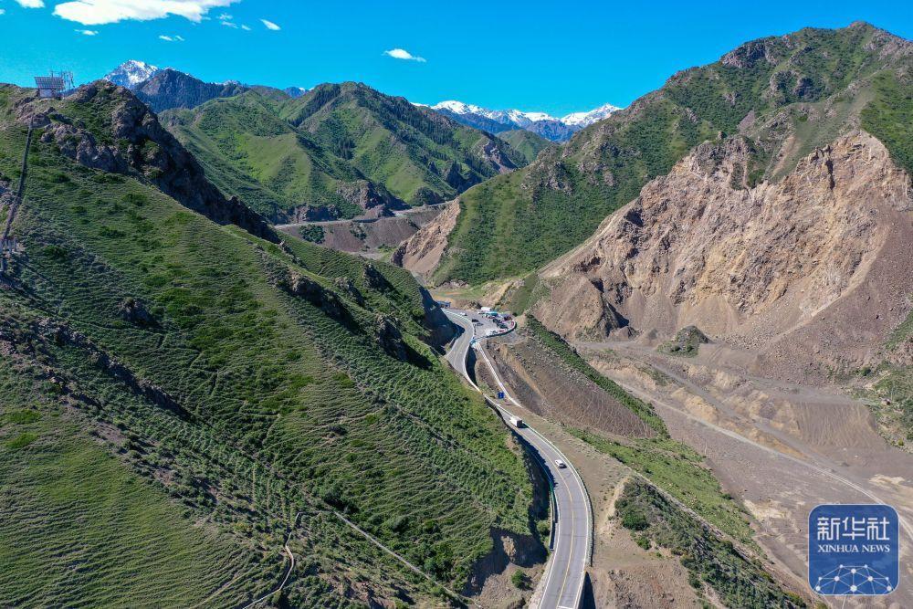 车辆行驶在新疆独库公路上(2021年6月20日摄,无人机照片)。