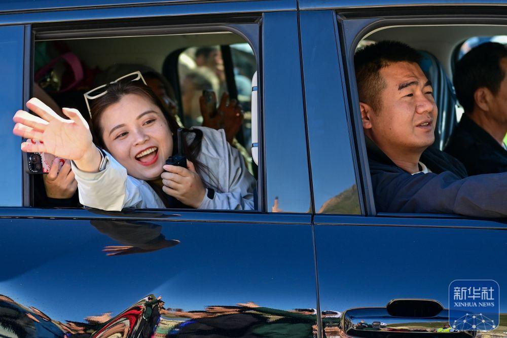 6月1日,在新疆塔城地区乌苏市独库公路驿站,游客在车上向当地群众挥手致意。