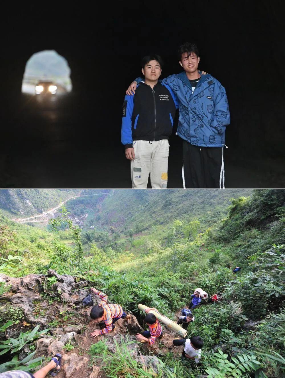拼版照片:上图为2023年1月20日,在大化瑶族自治县板升乡弄勇村,22岁的蒙宣任(左)和弟弟蒙宣汰站在通往弄勇小学的隧道旁合影,隧道上方是他们儿时上学需要攀爬的“天梯”;下图为2012年9月3日,在大化瑶族自治县板升乡弄勇村,蒙宣汰(左一)、蒙宣任(左二)爬山路去学校。蒙宣任目前在辽宁省交通高等专科学校读书,弟弟蒙宣汰从技校毕业后在广东一家汽修厂上班。组图均由新华社记者 黄孝邦 摄