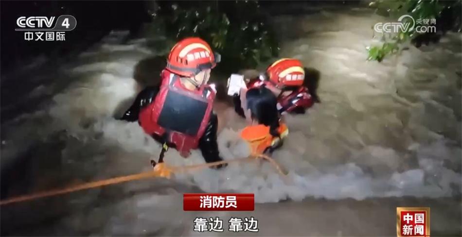 6月1日,福建漳州市漳浦县遭遇强降雨天气,在赤土乡万安村,村道和旁边的树林都被洪水淹没,一女子骑电动自行车行至该路段时,连人带车被洪水冲走。消防员赶到现场后,发现女子正紧紧抓住一棵树,体力已严重透支。两名消防员携带水域救援装备,借助安全绳,来到被困女子身边,给她穿上救生装备。