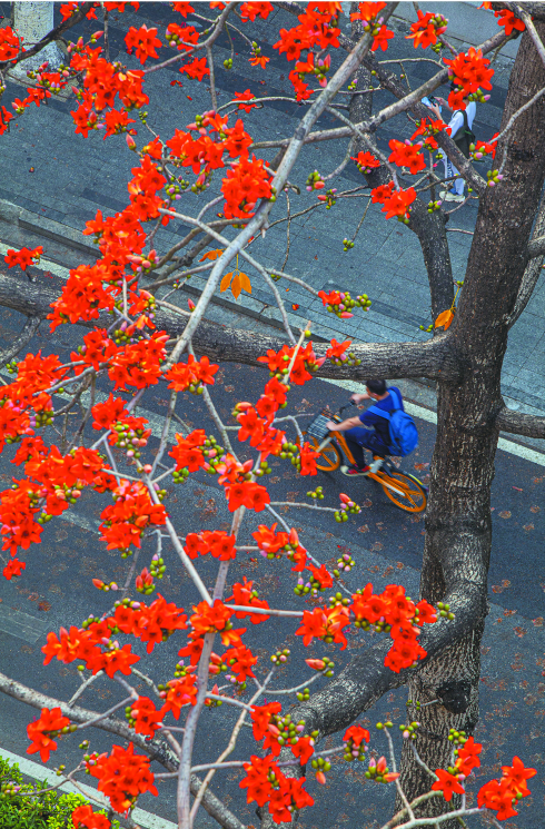 广州市民在木棉花下骑行。黄 剑摄(人民视觉)