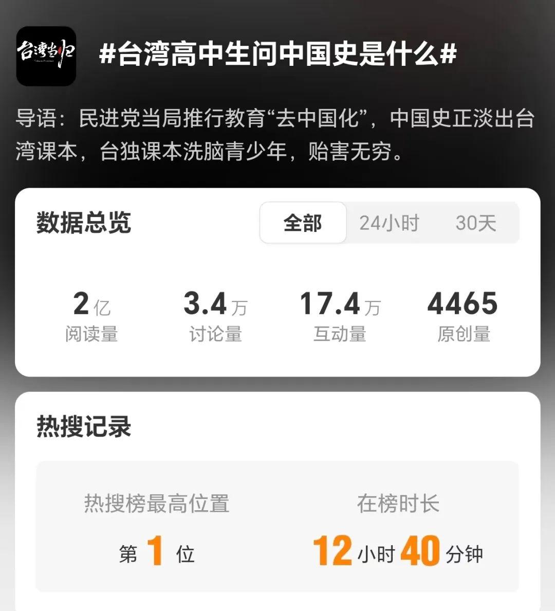 海报相关话题#台湾从来不是一个国家也永远不会成为一个国家#阅读量19亿,#中国终将实现完全统一#阅读量17亿,两个话题先后登顶热搜榜第一,浇灭“台独”幻想。有台湾网友在总台报道下留言分享自己与大陆的故事,得到了大陆网友的热烈回应。
