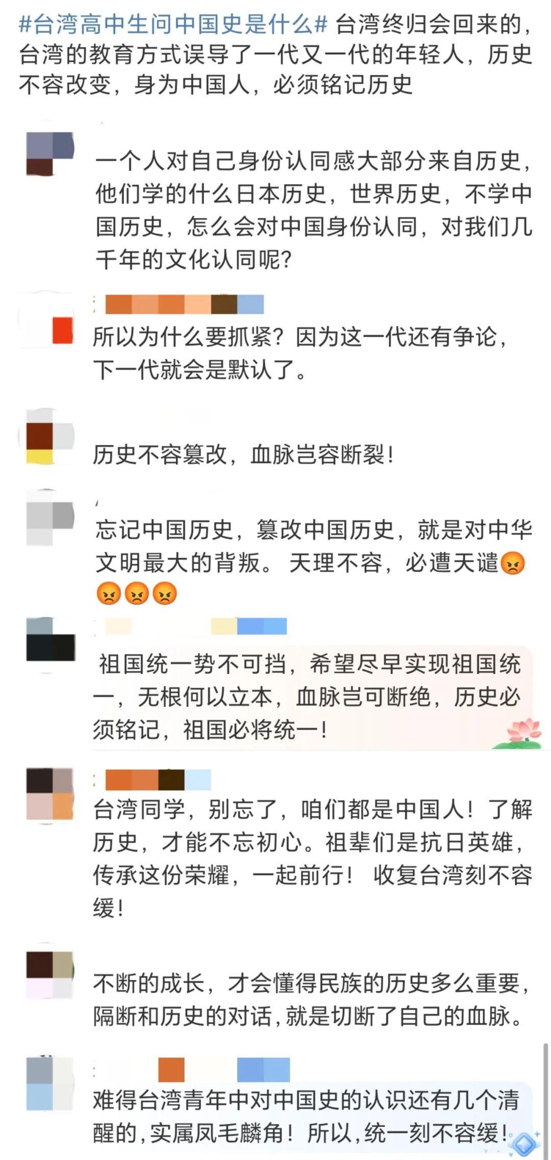 短短几分钟的视频,引起上万网友深夜讨论。有对这种教育的愤懑,有对台湾年轻人的呼吁,有对篡改历史的担忧,希望两岸早日统一的愿望也在此刻变得更加强烈。“历史不容篡改,血脉岂容断裂!”