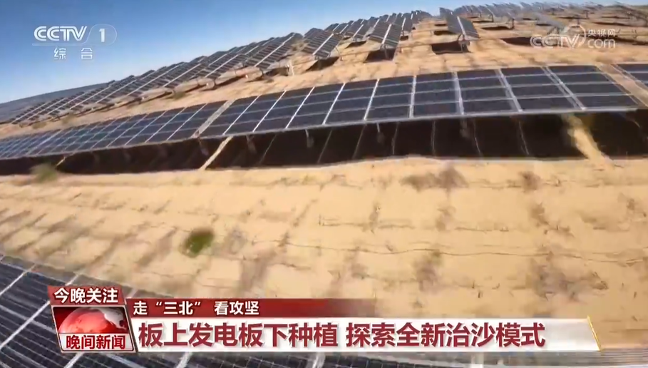 总台记者 李欣蔓:治沙的脚步不但没有停,还在不断探索新的治沙模式。现在我们看到的是鄂尔多斯一个已经建好、并网发电的光伏项目,板上发电,板下种植,一个空间全方位利用。三重防线,构建起了全新的生态治沙模式。有一个数据值得我们关注,这里的光伏项目占地39万亩,与此同时,生态治理面积也将规划完成39万亩。在国家推进光伏治沙项目开发建设的进程中,我们看到越来越多的企业参与其中,在发展新能源产业的同时共同担负起治沙的责任,为一片蓝海,一片绿洲的建设,贡献更多的力量。