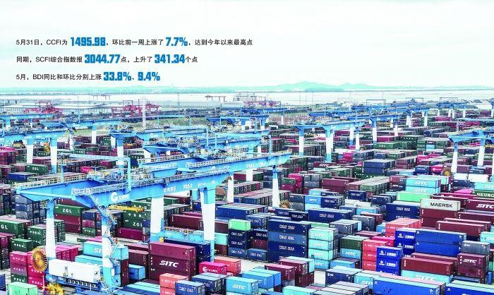 5月31日,上海航运交易所公布的最新一期CCFI为1495.98,环比前一周上涨了7.7%,达到今年以来的最高点。同期,SCFI综合指数报3044.77点,上升了341.34个点,所有13条细分航线中,仅日本关东线运价环比小幅下跌,其余12条航线全部上涨。5月,BDI同比和环比分别上涨33.8%、9.4%。