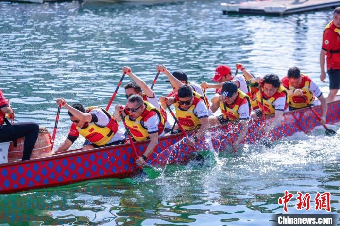中新社北京6月7日电 日前,一场“超燃”的龙舟赛在西班牙加泰罗尼亚自治区巴达洛纳市港口举行。一艘艘龙舟在海面上乘风疾驰,行如蛟龙出水,桨下浪花激扬。伴随着铿锵的鼓点,划手们举桨、插桨、拉桨,动作整齐划一、配合默契。岸边人潮涌动,呐喊声不断。