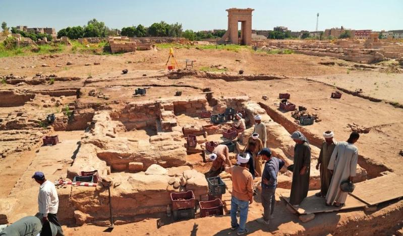 在中埃卢克索孟图神庙联合考古项目所在地,工作人员挖掘清理神庙遗址附近的第四小神殿(2024年5月7日摄)。中埃联合考古项目组供图