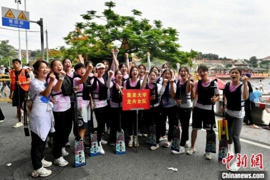 海峡两岸龙舟赛在厦门集美上演。图为集美大学龙舟女队参加比赛。中新社记者 吕明 摄