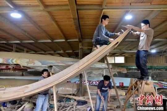 龙舟厂内,造船师傅们各显神功,刀起锤落,在木花四溅中,传承着龙舟传统手工制作技艺。中新社记者 张斌 摄