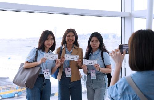 6月1日,前往上海的香港青年实习生在香港机场合影留念。 新华社记者 陈铎 摄