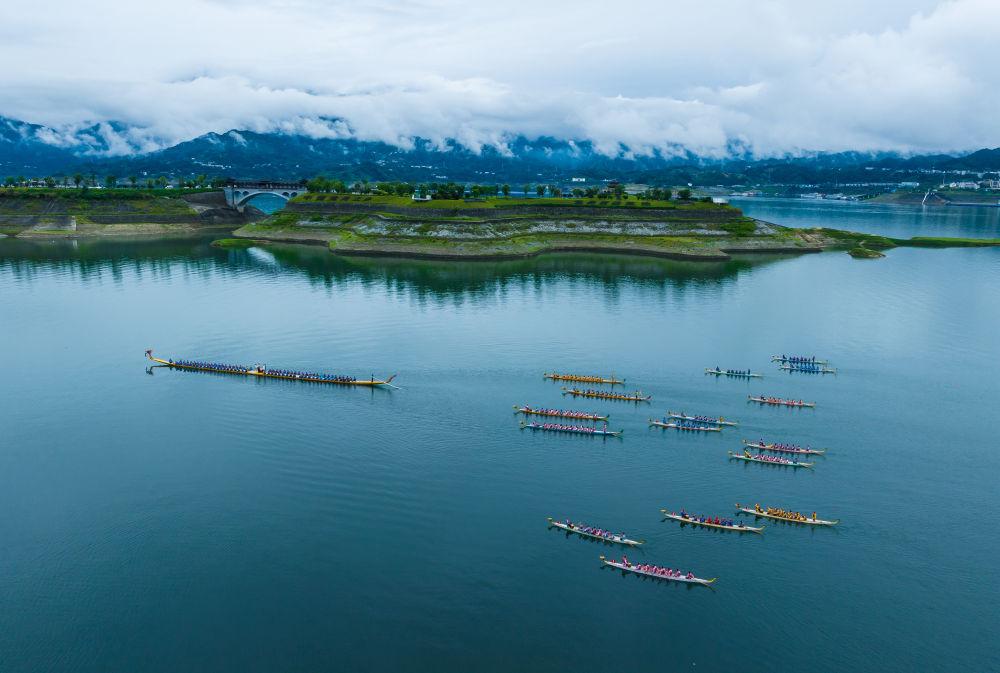 湖北省秭归县举行龙舟训练迎端午(无人机照片)。新华社发(郑家裕 摄)