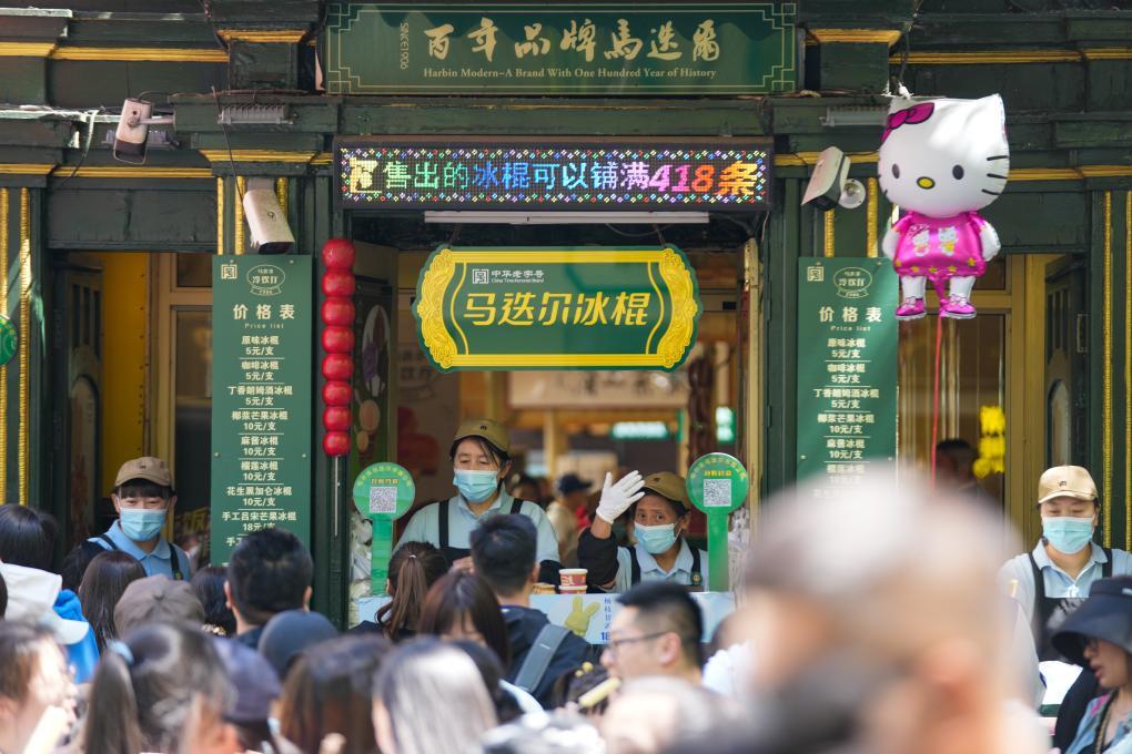 5月1日,在哈尔滨中央大街上,马迭尔冰棍的销售人员在招揽顾客。 新华社记者 王建威 摄