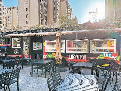 在霍尔果斯街头,装饰着中欧班列字样的餐吧。