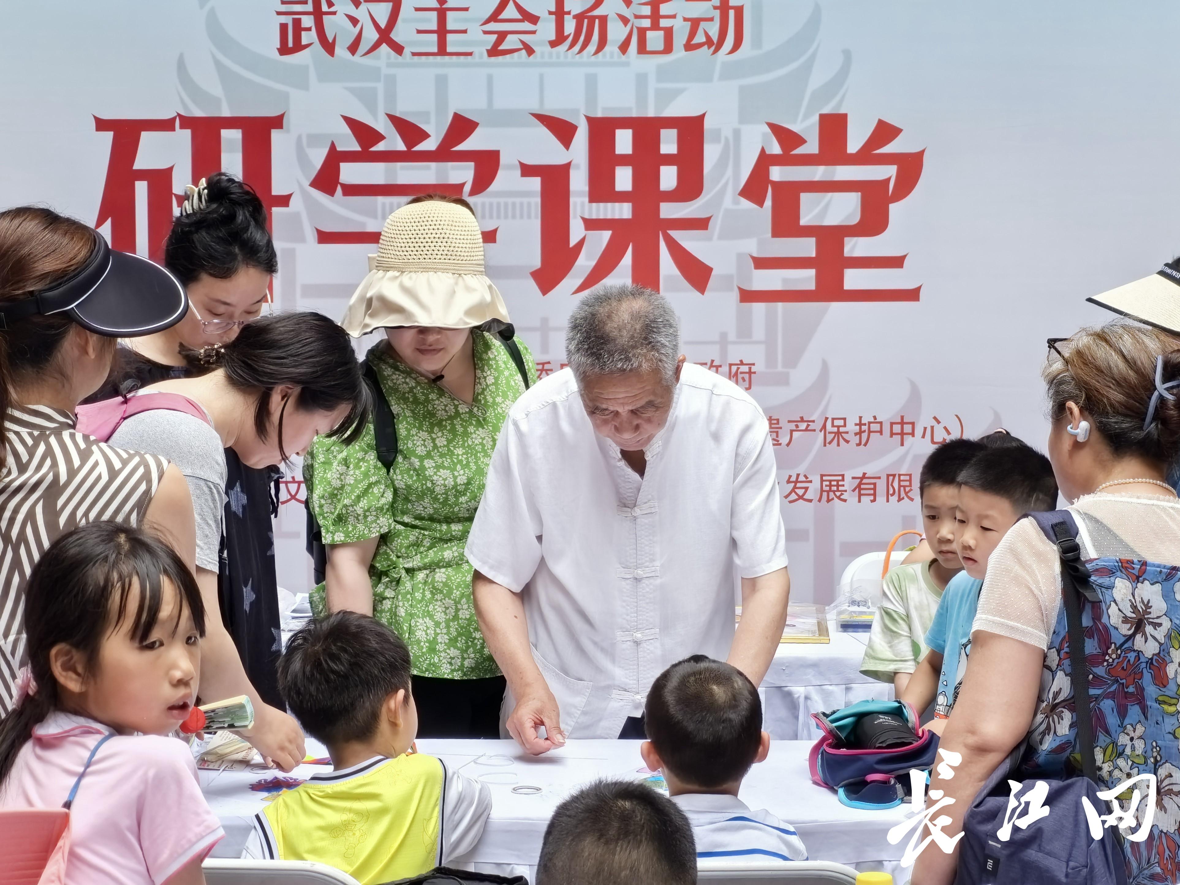 非遗研学课堂上,小朋友们在湖北省大师级民间工艺传承人、湖北省民间工艺美术家鲁应仁的带领下制作手工风筝。长江网记者熊美琪 摄